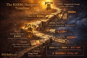 If even 30-50% of the remaining catalog reverts (conservative estimate), Snoop loses U.S. control over streaming royalties, syncs, samples, and licensing for key tracks. At $6 million/year baseline plus hip-hop catalog growth, that’s easily $20-50 million+ in lost future revenue over the next decade.